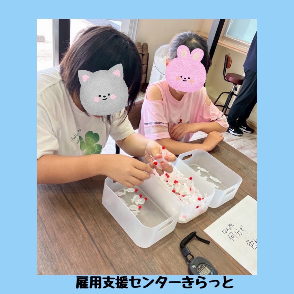 中高生を対象に、8月に作業所体験に行きました!今年は「雇用支援センターきらっと」「さつき作業所」「生活介護事業所バンバン」に行き、働くことについてのお話を聞いたり、実際にお仕事をされている所を見学させていただいたり、作業の体験をさせていただきました。初めての場所であったり、初めての体験をする子もいたのではじめは緊張する姿も見られていましたが、作業所の方々も優しく丁寧に教えてくださり次第に緊張もほぐれ貴重な体験をさせていただくことができました。子ども達に行ってみた感想を聞くと「楽しかった!」「疲れたー」「がんばってお仕事した!」といった声も聞かれていました。子ども達にとって働くことのイメージがもてたり、自信に繋がる経験になってくれているといいなと思います。