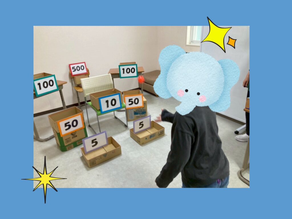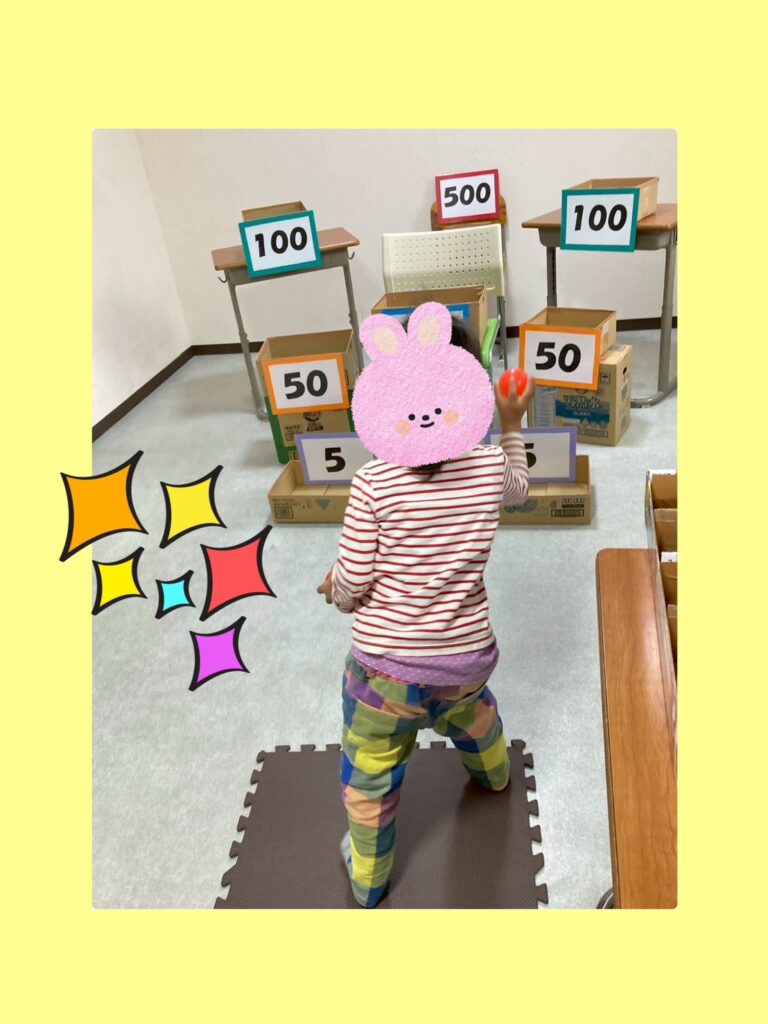 活動で『玉投げゲーム』をしました!点数が貼ってある箱にボールを投げてもらい、合計点を競ってもらいました🔥1人6球ずつ挑戦しました。子どもたちは箱に貼ってある点数を確認すると一番遠い場所にある500点を見つけて、盛り上がっておられました♪活動中は500点の箱を狙って一気に点数を稼いだり、近くの箱から着実に点数をためたりとそれぞれ作戦を立てて楽しんでおられました。なかなかボールが入らない時は支援員にコツを聞いて、諦めずに挑戦しておられました✨
