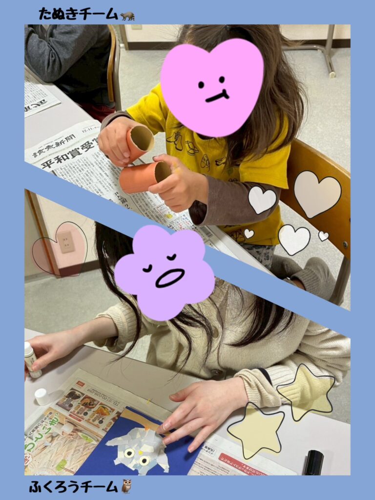 ・ふくろうチームにはちぎり絵でふくろうの体を作ってもらいました。細かな作業でしたが進めるごとに自分を励ましながら最後まで完成させることができました🦉