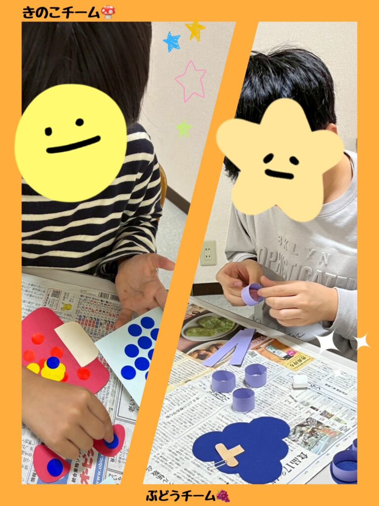 活動で『きのこ・ぶどう・ふくろう・たぬき』を作りました!4つのチームに分かれて活動に取り組みました。