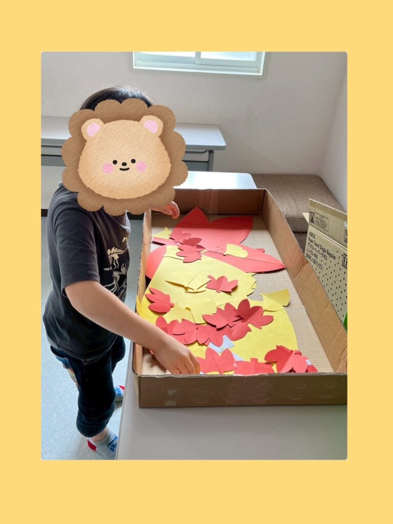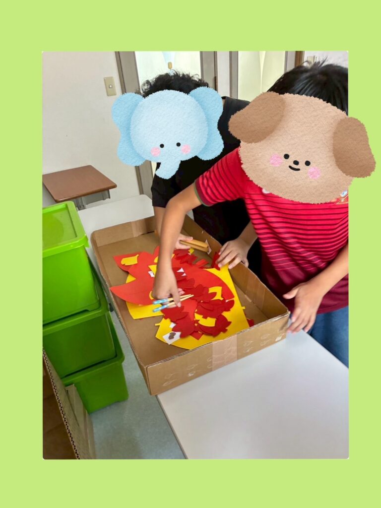 活動で『秋の味覚探し』をしました!落ち葉の中に埋もれている旬の果物や野菜のイラストを探していただきました。見つけたイラストは箸で掴んで表に並べていただきました🥢イラストの中には春や夏が旬の野菜を紛れてあり、表を見ながら分別していただきました。 活動が始まると子どもたちは落ち葉をめくったり、動かしたりしてイラストを探しておられました。ペアで行ったチームは相手が間違えておいたイラストを直したり、「いそげ」と声を掛け合って協力して取り組んでおられました😊