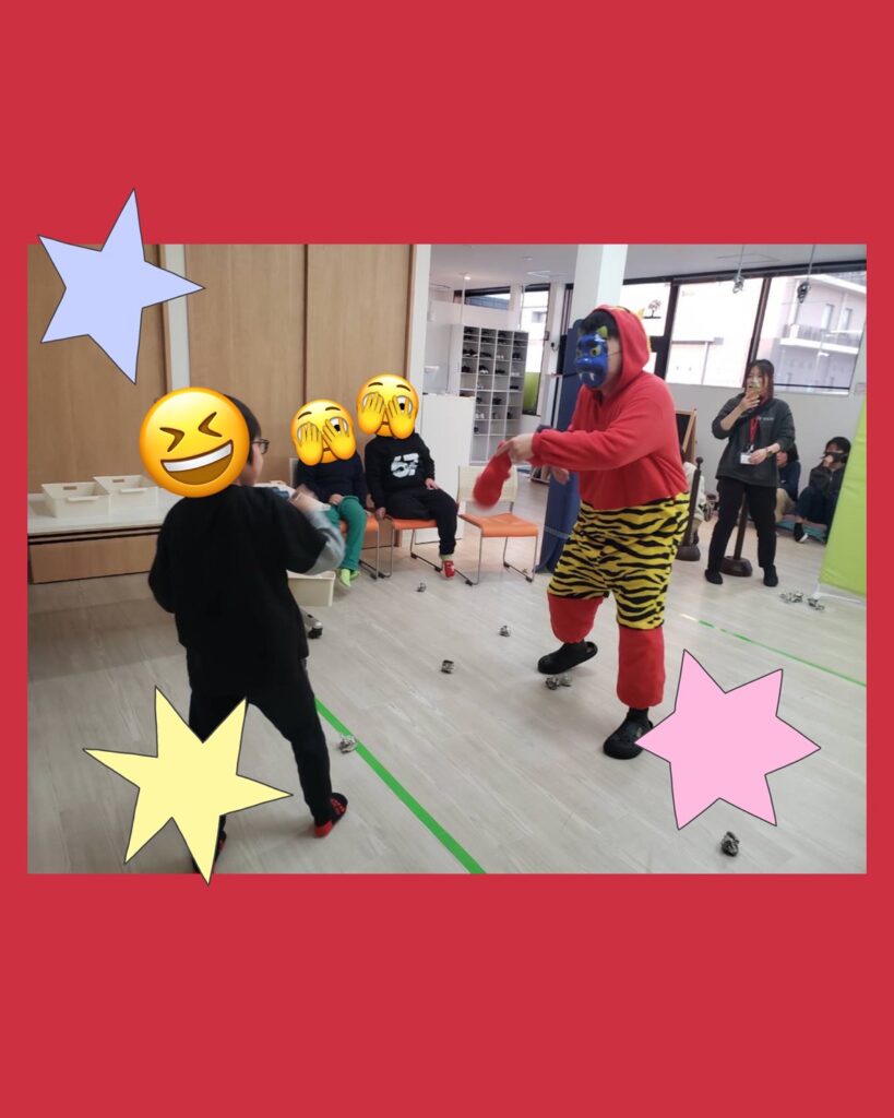 活動で「豆まきゲーム」をしました。 鬼に新聞で作った豆を投げて鬼が弱っている間に反対側まで渡り、恵方巻を取って元居た場所まで戻り、お皿に乗せるという活動をしました。 鬼役は支援員が行い、鬼が登場した時には鬼を見て怖がる子もいれば喜ぶ子もいました。一生懸命豆を投げて逃げ回る子ども達はとても楽しそうでした。鬼役の支援員もへとへとになるくらいとっても盛り上がった活動でした♪