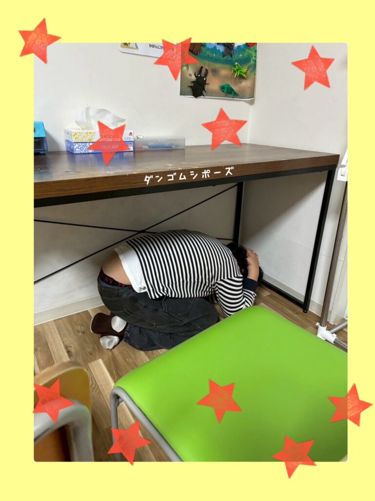 活動で地震を想定した『避難訓練』を行いました。地震が起こった時にとるべき行動を説明してから「だんごむしポーズ(頭を守るポーズ)」の練習をしました。子どもたちは椅子の下に入ったり、頭を手で覆ったりと上手に頭を守ることができていました。避難訓練をどうしてするのかという質問には「命を守るため」と返答があり、真剣に考える姿がみられました。訓練は自由時間中に避難警報を鳴らして実際に玄関に避難してもらいました。避難警報が鳴ると驚きながらも「隠れるぞ」と机の下に入っておられました。頭を守りながら支援員の指示が聞こえるまで静かに待つことができていました。しんばでの災害時の対応を経験する活動になりました。今後も定期的に実施していきます。
